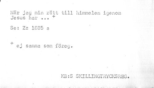 //// När jag min rätt till himmelen igenom Jesus har »*• * //// Se: Zz 1885 a //// ej samma som föreg* //// < //// KB:S SKILLINGTRYCKSREG. ////