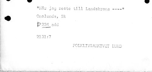 //// "När jag reste till Landskrona ---- //// ^^ Onslunda, Sk //// P224_ add 2131:7 //// FOLKLIVS ARKIV ET LUND //// f //// i*-,—_____ . . _ , ___. . ^ ////