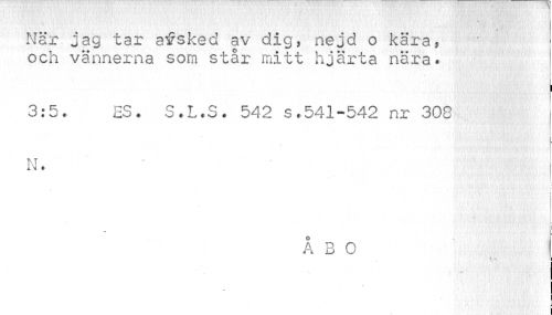 //// -.->'. \ . , 1 //// Nar jag tar afsked av dig, nejd o kära, och vännerna som står mitt hjärta nära. //// i > //// i //// 3:5. ES. S.L.S. 542 s,541-542 nr 308 N. //// ! i //// ÅBO //// j //// % //// \ //// I ////