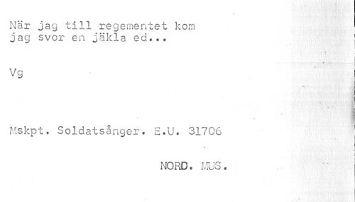 //// J //// När jag till regementet kom jag svor en jäkla ed... //// t //// é //// Vg //// V. .1 //// Mskpt. Soldatsånger. E.U. 31706 1 //// i //// NORD. MUS. ////