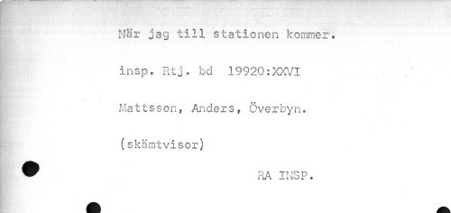 //// _ //// När jag till stationen kommer. //// * //// ¦ //// insp. Rtj. bd 19920:XXVI //// i //// Mattsson, Anders, Överbyn. //// ¦ ji //// (skämtvisor) ® RA INSP. ////