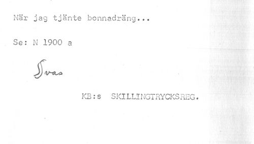 //// När jag tjänte bonnadräng... //// Se: N 1900 a //// <f //// KB:s SKILLINGTRYCKS REG. //// c //// m . «'»¦.. -ii; 'i. ////