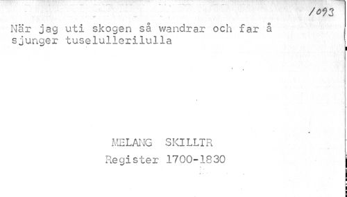 //// /073 //// ... -t- ¦ • r . ¦ //// När jag uti skogen så wandrar och far å //// sjunger tuselullerilulla I //// t //// v //// - //// * //// MELANG SKILLTR Register 1700-1830 j //// ' H ////