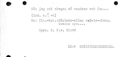 //// När jag uti skogen så vandrar och far... (End. v.! -6) //// Se: Tit.-kat.:Kärleks-eller valets-visor, //// tvenne nya.... //// X, //// Upps. 2. P.s. 26:49 //// KB:s SKlLLINGTRYCKSREG. ////