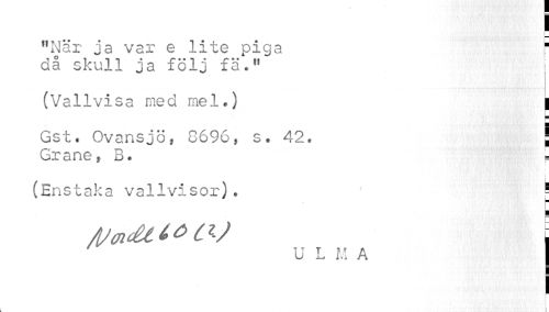 //// "När ja var e lite piga f //// då skull ja följ fä." j //// • • //// (Vallvisa med mel.) | //// Gst, Ovansjö, 8696, s. 42. ! Grane, B. //// (Enstaka vallvisor). * //// AJméti* \ //// U L M A //// , i //// . • : ¦../.. i i ////