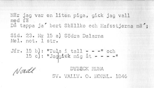 //// När jag var en liten piga, gick jag vall med fä //// Då tappa ja' bort Skällko och Hafsstjerna mä'j //// Sid. 23. Nr 15 a) Södra Dalarna //// Mel. not* 1. s t •i? ® //// Jfr. 15 b): "Tula i tall ---och //// 15 cj: "Jacgick mig åt - - - //// DYDECK RUNA 1 SV. VALLV. O. HORNL. 1846 ////