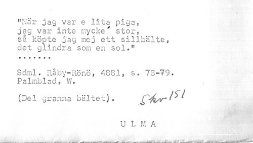 //// » //// % //// "När jag var e lita piga, jag var inte mycke* stor, så köpte jag mej ett sillbälte, //// det glindra som en sol." * « * # # « < //// Sdrnl. Råby-Rönö, 4881, s. 78-79. Palmblad,. W. //// (Del granna bältet). Cjwr^ //// U L M A ////