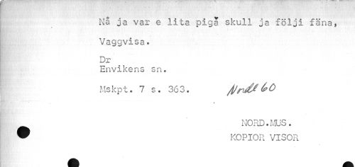 //// ¦ //// Nå ja var e lita piga skull ja följi fäna, //// Vaggvisa* //// Dr //// Envikens sn. //// Mskpt. 7 s. 363. ftnd* //// » //// NORD.MUS. //// ^ KOPIOR VISOR //// ¦ ////