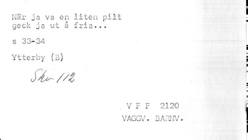 //// När ja va en liten pilt j //// geck ja ut å fria*?. //// s 33-34 //// S //// Ytterby (B) 1 //// Sk-//i \ //// i //// V F F 2120 j //// VAGGV* BARNV. | //// i ////