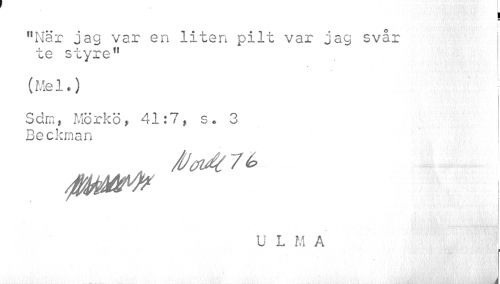 //// I //// "När jag var en liten pilt var jag svår te styre" //// (Mel.) //// Sdm, Mörkö, 41:7, s. 3 Beckman //// /U&ufy 7 é> //// U L M A //// , //// ¦ //// i ////