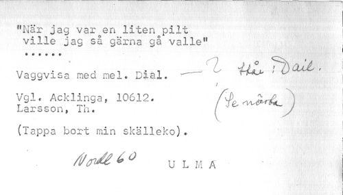 //// "När jag var en liten pilt | //// ville jag så gärna gå valle" , //// ****** ^^ //// • , "i ilL idcul, i //// Vaggvisa med mel. Di al. ....... ; ^^ //// l //// Vgl. Acklinga, 10612. Af ) //// Larsson, Th. / J //// v, //// (lappa bort min skälleko)* //// U LM A //// i ¦ //// i ////