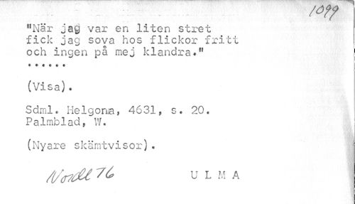 //// £u7f //// "När jag var en liten stret fick jag sova hos flickor fritt //// och ingen på mej klandra." t ««< t t //// (Visa). //// Sdml* He 1gona* 4631, s * 20. Palmblad, W. //// (Nyare skämtvisor)* //// /(/ 'tfdi 7 U L M A ////
