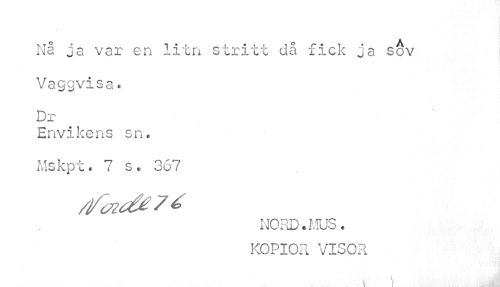 //// Nå ja var en iitn stritt då fick ja sov Vaggvisa« Dr //// Envikens sn« Mskpt. 7 s• 367 //// NORD.MUS. KOPIOR VISOR //// V ////