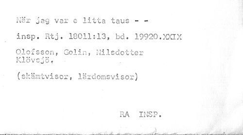 //// När jag var e litta taus - -insp. Rtj. 18011:13» bd. 19920.XXIX //// » //// Olofsson, Gol i n, Nilsclotter Klövsjö# //// (skämtvisor, lärdomsvisor) //// RA INSP. //// _____^ .....A, ,, ^ _____ ////