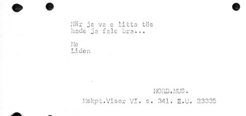 //// När ja va e litta tös hade ja falc bra... //// Me //// Liden //// v //// NORD. MUS. Mskpt.Visor VI. s. 341. E.U. 23335 ////