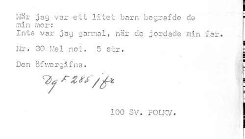 //// I //// När jag var ett litet barn begrafde de min mor: //// Inte var jag gammal, när de jordade min far. //// I //// Nr, 30 Mel not. 5 str. ; //// Den ofv/ergifna. ! //// 100 SV. FOLKV. I ////