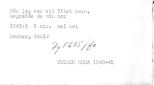 //// När jag var ett litet barn, 1 //// begrafde de min mor //// 1842:2 5 str. mel not //// Norberg Vsmld //// DYBECK RUNA 1842-45 1 //// ...,____„ _ ____ _....... ___ _ .. J ////