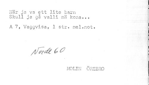 //// När ja va ett lite barn Skull ja gå valli mä kona... //// ¦ //// A 7, Vaggvisa? 1 str. mel.not. j //// /tfcdkC* \ //// MOLIN ÖREBRO ////