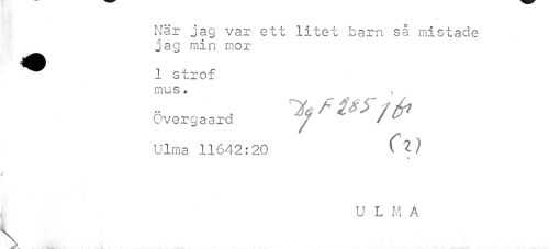 //// - //// När jag var ett litet barn så mistade jag min mor //// ^^^ 1 strof //// mus. //// Ulma 11642:20 C *) //// B //// U L M A //// \ //// - ML i . ... i ////