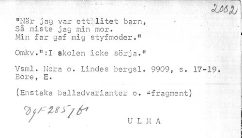 //// I • //// "När jag var ett. litet barn, //// Så miste jag min mor. //// Min far gaf mig styfmoder." //// Omkv.";I akolen icke sörja." //// Vsml. Nora o. Lindes bergsl. 9909, s. 17-19. Bore, E. //// (Enstaka balladvarianter o. -fragment) //// yfFtesT/é* I //// / U L M A I ////