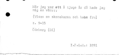 //// När jag var ett å tjugo år då hade jag mig en vän... //// ^ (Visan om skomakaren och hans fru) //// s. 9-15 //// Ödeborg (Dl) //// I.F.G.H.: 1891 ////