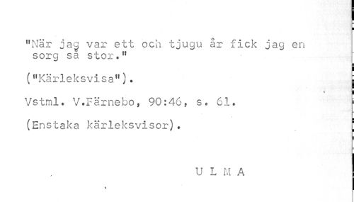 //// "När jag var ett och tjugu år fick jag en sorg sa stor." //// ("Kärleksvisa"). j //// Vstml. V.Färnebo, 90:46, s. 61. i //// (Enstaka kärleksvisor). r //// U L M A //// \ ////