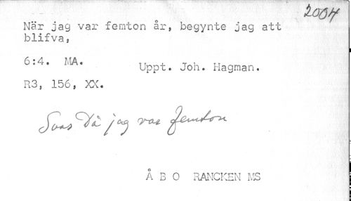 //// -- o »UIQ/f //// När jag var femton år, begynte jag att blifva % //// i //// 6:4, VAt Uppt. Joh. Hagman. //// R3, 156, XX. //// ¦ //// ÅBO RANCKEN KS ////