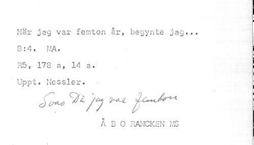 //// När jag var femton år, begynte jag... //// 0:4. MA. ! //// R5, 173 a, 14 a. //// Uppe. Nessler. • ; //// %/y le^Ar^ ! //// ÅBO RANCKEN MS ////