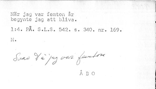 //// När jag var femton år //// begynte jag att bliva. , //// 1:4. PÅ. S.L.S. 542. s. 340. nr. 169. N. //// åbo ////