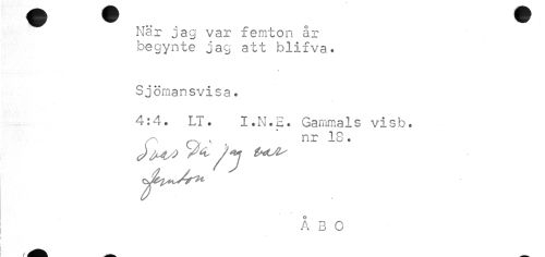 //// När jag var femton år begynte jag att blifva. //// Sjömansvisa. //// 4:4. LT. I.N.E. Gammals visb. //// A 3 O ////