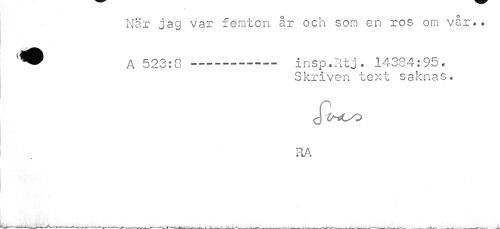 //// När jag var femton år och som en ros om vår.* //// A 523:0 ----— insp.Rtj. 14334:95. //// Skriven text saknas. //// J^tCO //// RA //// r ////