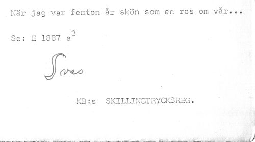 //// När jag var femton år skön som en ros om vår... Ss: E 1387 a3 //// Jf^o //// KB:s SKILLINGTRYCKSREG. //// i) ////