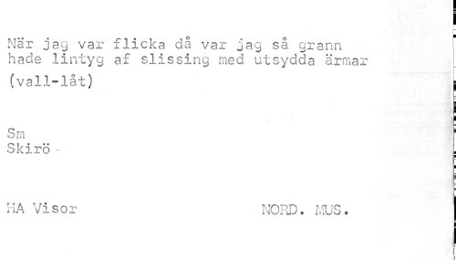 //// I //// När jag var flicka då var jag så grann hacle lintyg af slissing med utsydda ärmar //// (vall-låt) I //// Sm 1 //// Skirö - //// i //// HA Visor NORD. MUS. ////