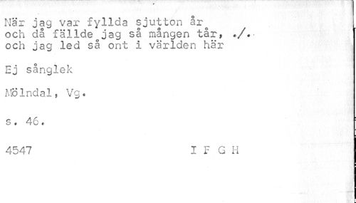 //// När jag var fyllda sjutton år //// och då fällde jag så mången tår, ./•• //// och jag led så ont i världen här //// Ej sånglek //// Mölndal, Vg* //// S. 46. : //// ¦ //// 4547 IF GM ////