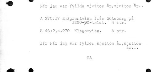 //// När jag var fyllda sjutton år,sjutton år.. //// A 270:17 Emigrantvisa från Göteborg på //// lS80-j50~talet« 4 str. //// 3 46:2,s.270 Klago-visa. 6 str. Jfr När jag var fyllen sjutton år,sjutton //// o //// O. X? * t e //// RA ////