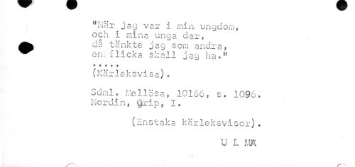//// "När jag var i min ungdom, och i mina unga dar, ^^ då tänkte jag som andra, //// ^^ en. flicka skall jag ha*" //// « c f t e //// (Kärleksvisa). //// Sdml. Mellösa, 10166, s. 1096. //// Nordin, §r ip, I * //// (Enstaka kärleksvisor)* //// U L MR //// //// /