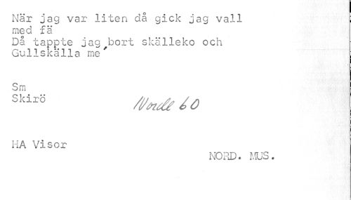 //// När jag var liten då gick jag vall ; //// med fä //// Då täppte jag bort skälleko och Gullskälla me' //// Sm //// Skirö éo //// HA Visor //// NOPJD. MUS. ////