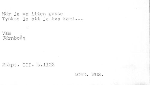 //// När ja va liten gosse Tyckte ja att ja hva karl... //// 4 //// Vsm //// Järnboås //// i //// Ms kp t. X I. X * s * 112 3 //// NORD. MUS. //// V )>¦.'¦ i i . tivV<UV'.\ A ////