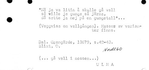 //// "Nä ja va litin å skulle gå vall så Bille ja gunga så järnaf //// •då satte ja mej på en gungetall"..* //// » //// (Vaggvisa om vallgången). Massor av varianter finns» //// Dal. Grangärde» 13679, s.42-43. //// Rlivt n //// /i/si&t (P o //// (... gå vall i mossen..») //// U L M A ////