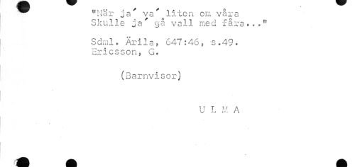 //// "När ja' va' liten era våra Skulle ja' gå vall med fåra..." //// Sdml. Äri1a * 647:46, s.49. Ericsson, G. //// (Barnvisor) //// U L M A ////
