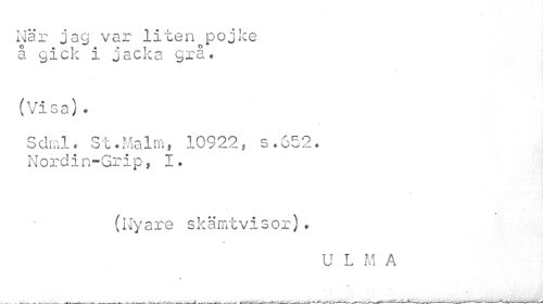 //// När jag var liten pojke å gick i jacka grå. //// (Visa) ? //// Sdml. St *Malm, 10922, s.652* //// Nordin-Grip, I. //// (Nyare skämtvisor). //// U L M A ////