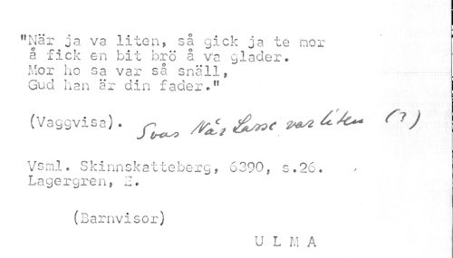 //// "När ja va liten, så gick ja te mor . å fick en bit bro å va gläder• Mor ho sa var så snäll, Gud lian är din fader." //// i //// (Vaggvisa), ^^ ^ ^ ) //// Vsml* Skinnskatteberg, 6390, s.26. Lagergren, //// (Barnvisor) //// U L M A ////