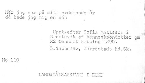//// I //// När jag var på mitt ardetonde år ] //// då hade jag mig en vän //// S t 1 //// I //// Uppt.efter Sofia Mattsson i ,, //// Brantevik af hennesksdndotter gm xx Lennart Ribbing 1895. //// Ö.Möbbelöv, Järrestads hd,Sk. //// No 1.10 //// LANDS MÅLS ARKIVET I LUND //// j ////