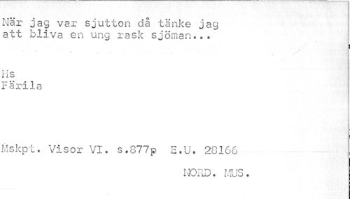 //// När jag var sjutton då tänke jag //// att bliva en ung rask sjöman... j //// i ¦ //// . //// Els //// Farila //// Vlskpt. Visor VI. s.877p S.U. 20166 //// NORD. MUS. I ////