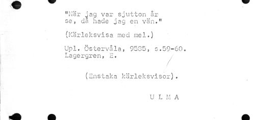 //// "När jag var sjutton år se, då hade jag en vän." //// (Kärleksvisa med mel.) //// Upl. Östervåla, 9535, s.59-60. Lagergren, E. //// { //// //// /(Enstaka kärleksvisor). //// U L M A ////