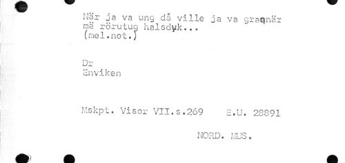 //// När ja va ung då ville ja va gragnär mä rörutuq halsdyk... (mel.not.j //// Dr //// Hnviken //// Mskpt. Visor VII.s.269 E.U. 28891 //// NORD. MUS. //// mmk) ////