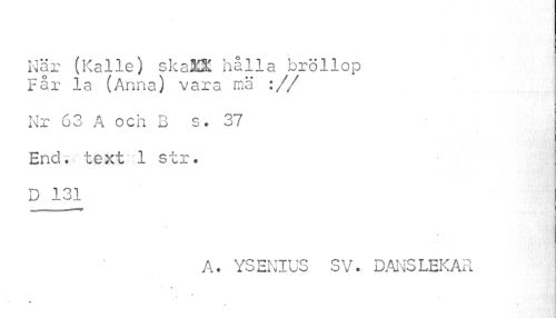 //// När (Kalle) skal&X hålla bröllop Får la (Anna) vara mä : //// //Nr 63 A och B s. 37 //// End. text 1 str. //// D 131 //// A. YSENIUS SV. DANSLEKAR //// s • ////