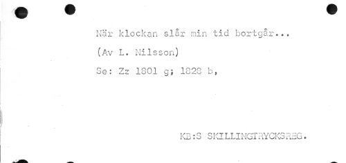 //// • • • //// När klockan slår min tid bortgår... //// (Av L. Nilsson) //// Se: Zz 1301 g; 1828 b* //// KB:S SKILLINGTRYCKS REG. ////