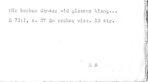 //// När korken dansar vid glasens klang*.. i //// B 73:1, s. 27 En vacker visa* 13 str* //// | i //// RA i ////