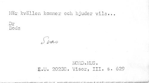 //// När kvällen kommer och bjuder vila... //// Dr //// Boda //// S i/^o //// NORD. MUS. E.U. 20230. Visor, III. s. 629 ////